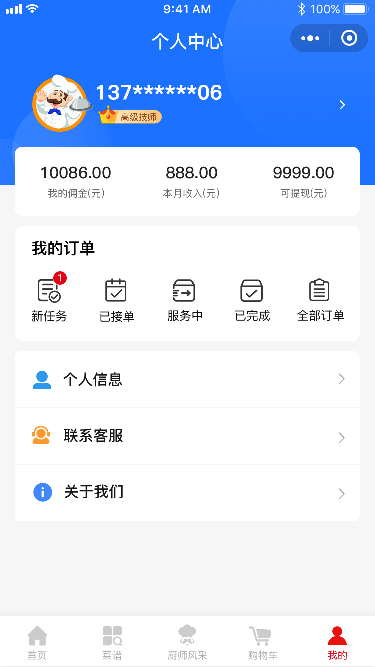 主要用于厨师接单以及上门做菜完成任务,提现等等功能